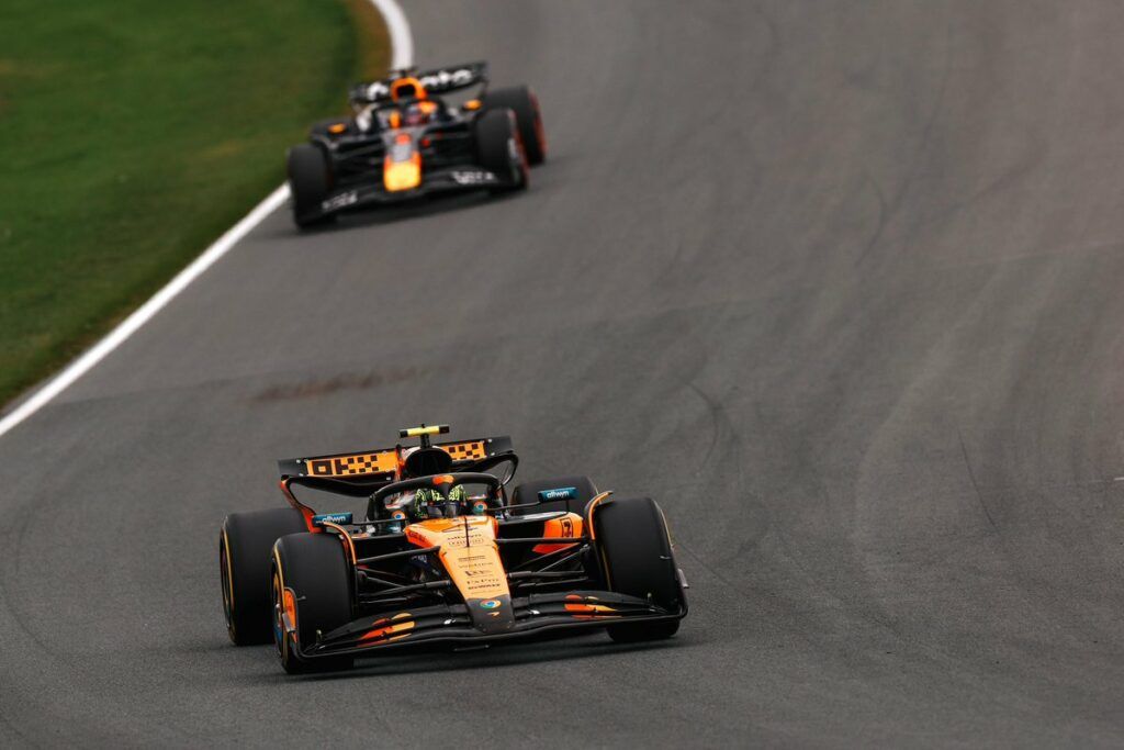 A Zandvoort viene comunicato ai piloti che la pioggia sta per arrivare. Nel frattempo Norris si riprende il secondo posto con un sorpasso all’esterno in curva 1 e puntando il compagno di squadra. Le McLaren, come prevedibile qui in Olanda, fanno il vuoto in gara mentre Norris accorcia le distanze su Piastri.